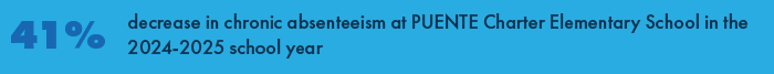· Achieved a six-year renewal for PUENTE Charter Elementary School and reduced chronic absenteeism by 41%